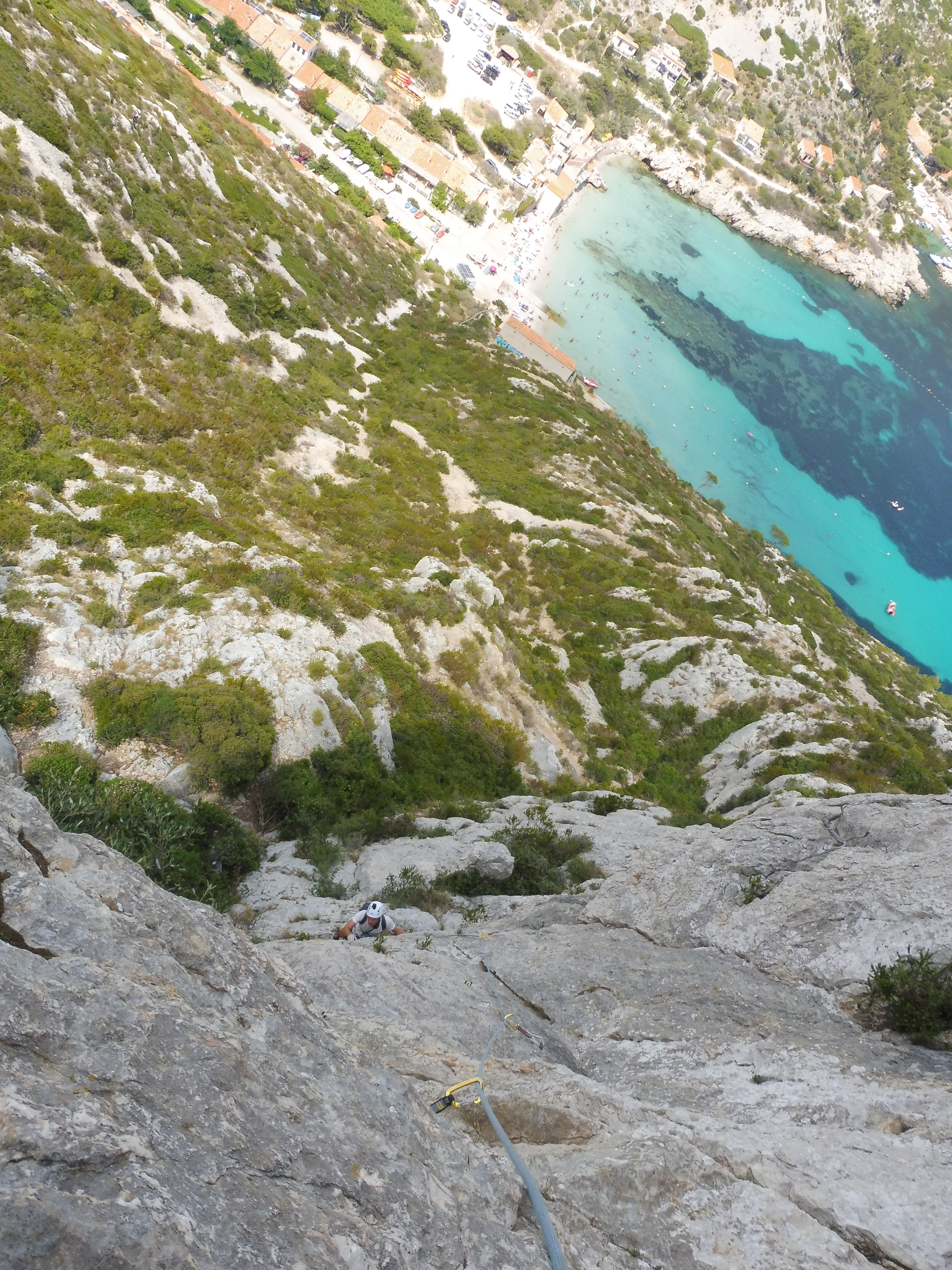 Depuis la calanque de Sormiou, on voit du caillou partout. Juste au dessus la plage, une aiguille formant un éperon arrondi domine la crête fermant le paysage. La voie est très courte, mais le rocher est aussi classe que dans les voies plus longues, et l’équipement solide permet une initiation intéressante à la grande voie. Celle ci étant située sur le chemin du ruompe cuou, elle se combinera parfaitement avec une voie plus longue. Ainsi, on peut profiter des deux versants du bec de Sormiou, et de deux paysages aussi différents que magnifiques.