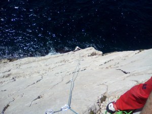 En revanche, malgré le niveau général plutôt moyen des voies, l’escalade ici (comme partout ailleurs, finalement!) demande des précautions et un minimum d’expérience. L’approche, bien que courte, est assez « casse gueule », et l’accès en rappels impose une sortie obligatoire vers le haut (sinon… retour à la nage!). Cela rend le site particulièrement charmant, et même si les forts grimpeurs n’y ressentiront pas nécessairement l’engagement, les novices en grande voie pourront y faire leurs armes.