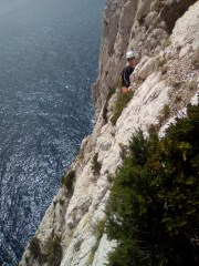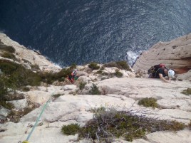 Voici une superbe grande voie, dans un cadre à nouveau exceptionnel. Au Ruompe Cuou, on grimpe la journée entière au dessus de la mer, face aux îles. Cette facette, fort peu raide, est pourvue d’un rocher exceptionnel, parfaitement sculpté, encore généralement très adhérent. Les voies y sont bien équipées et souvent très proches, sans que cela ne soit réellement gênant.