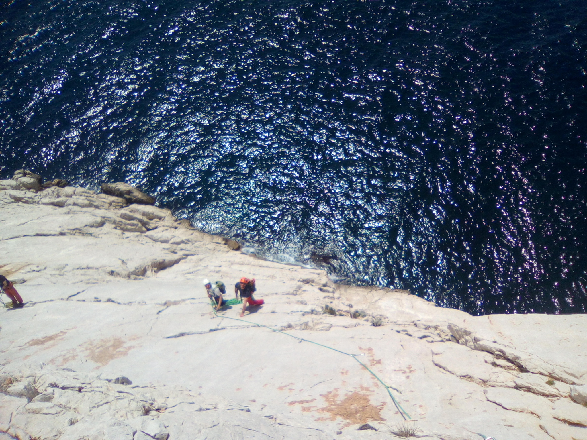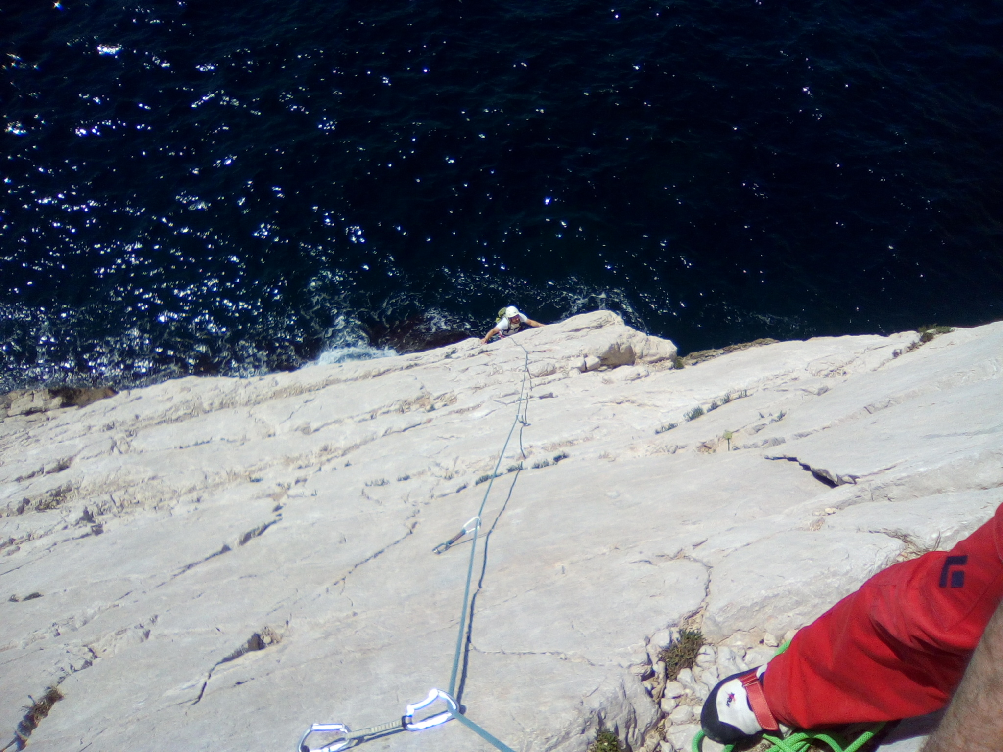 Voici une superbe grande voie, dans un cadre à nouveau exceptionnel. Au Ruompe Cuou, on grimpe la journée entière au dessus de la mer, face aux îles. Cette facette, fort peu raide, est pourvue d’un rocher exceptionnel, parfaitement sculpté, encore généralement très adhérent. Les voies y sont bien équipées et souvent très proches, sans que cela ne soit réellement gênant.