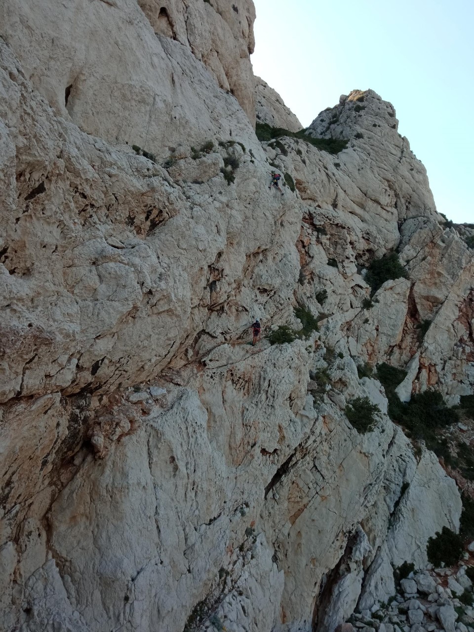 Secteur archi classique des Calanques, le « bec » de Sormiou est parcouru de nombreuses voies abordables, au large de la plage, sur cette falaise à l’ombre l’après midi en été : une aubaine ! Ce secteur a été depuis très longtemps à la mode, et de nombreuses voies y ont été tracées durant des décennies. Certaines d’entre elles sont devenues mythiques, alors que d’autres ont disparues, ou ont été reprises par des parcours plus intéressants. Dans notre cas, « sur les traces du passé » reprend deux vieilles voies, la voie du collet, facile et indirecte, empruntant l’antécime dans sa partie médiane, et celle de l’araignée, plus droite.