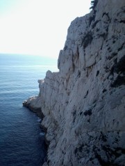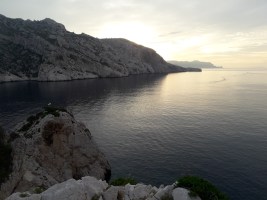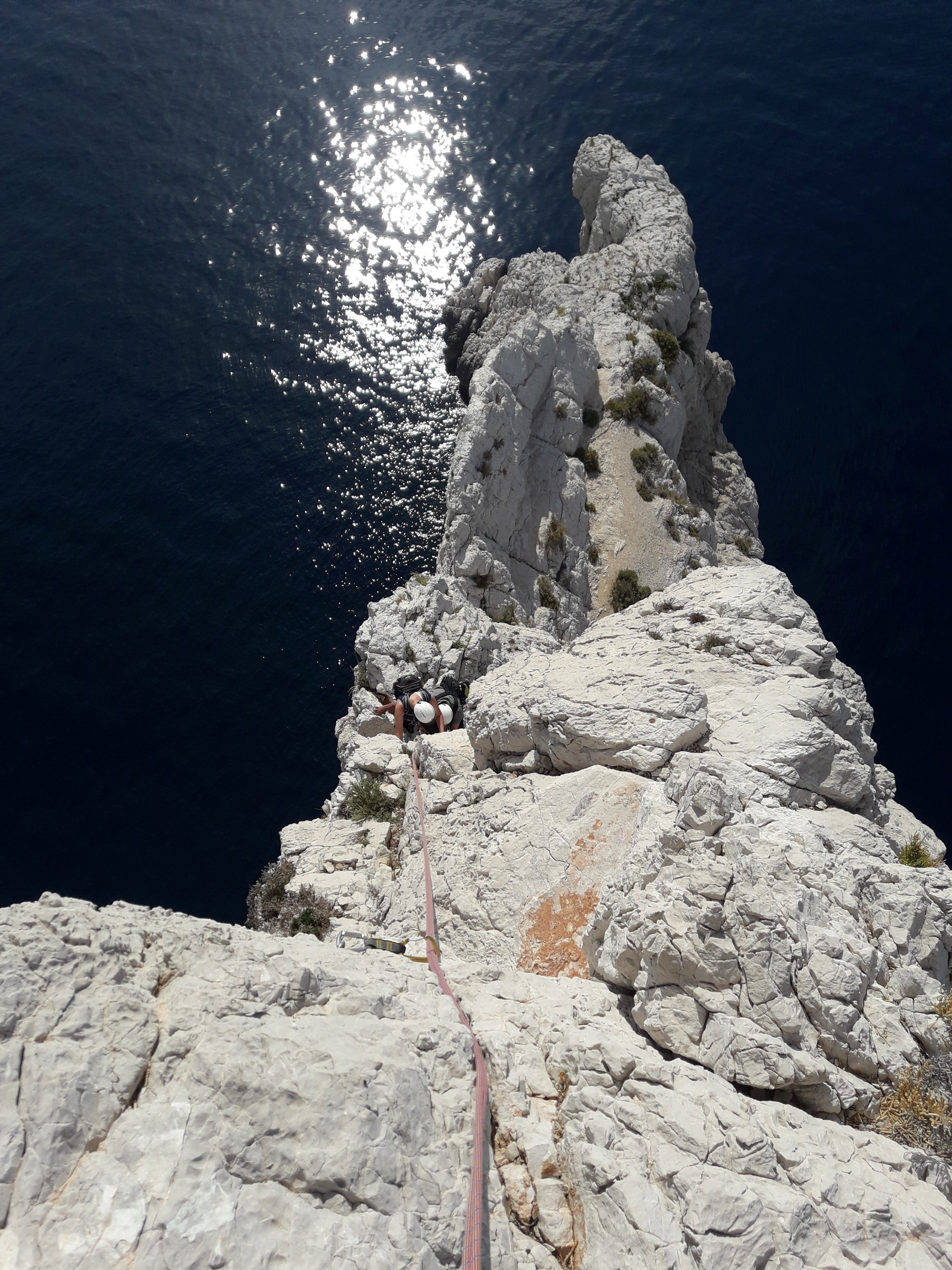 Mais une fois au bout du cap, il faudra bien rentrer. A moins de faire du bateau stop, deux options sont possibles. Soit faire le tour à pied et rentrer plus ou moins tranquillement, soit remonter l’arête de l’extrême bec. On prolonge dans ce cas l’escalade par quatre ou cinq longueurs sympas, mais pas aussi débonnaires que la cotation du topo pourrait laisser penser… Cette option permet également d’atteindre directement le sommet des crêtes, et ainsi de dominer l’ensemble de la calanque d’un coté, et le grand large de l’autre, avec, en son centre, les iles… le retour à pieds est ensuite plutôt aisé.