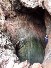 Il est alors temps de s’encorder. Une première dalle facile mais glissante nous dépose dans un amphithéâtre au ras de l’eau, sous des surplombs. Un premier véritable passage d’escalade (3c) nous ramène dans la paroi. Nous descendons alors une vire jusqu’à la grotte du Capelan. Attention en y entrant, le sol glissant est alors particulièrement dangereux… le site est superbe: dominés par des concrétions diverses, on se plaît à contempler au fond l’eau turquoise, renvoyant la lumière du soleil dans la grotte grâce à un large boyau par lequel l’eau circule… sous la grotte même. Les plongeurs passent parfois par ces trous sous-marins, mais nous allons devoir sortir autrement : une rampe patinée permet de sortir de la grotte, face au large…