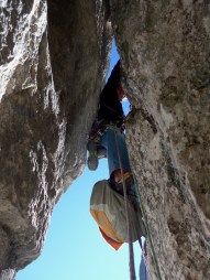 L2 : 6a, 45 mètres, 8 pitons; Droit au dessus dans la cheminée – relais intermédiaire dans une mini grotte avant d’attaquer le passage clé par la gauche (très gros bloc coincé, impressionnant!). Relais sur bloc, étrange…