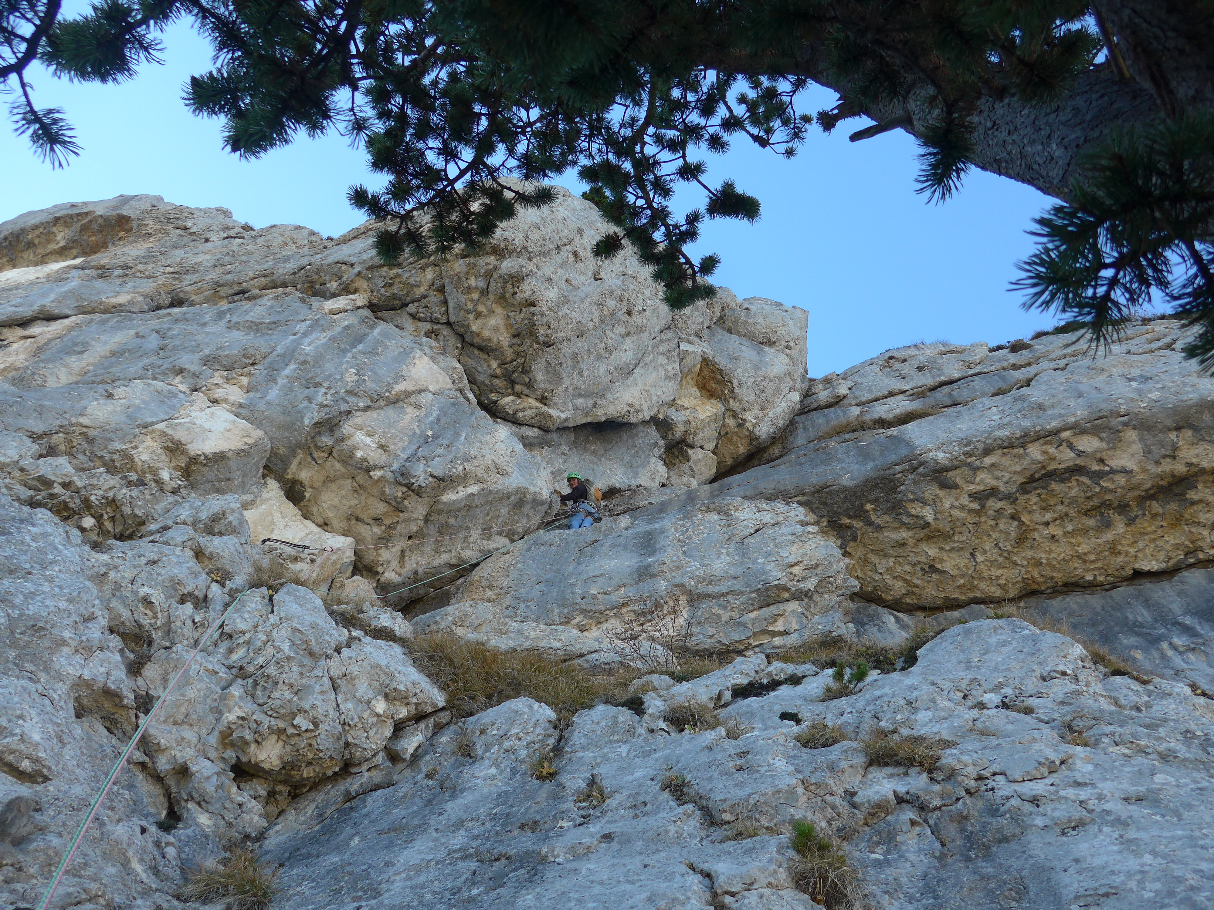 L10 : 4b, 50 mètres, rien; Passer un mur pour rejoindre une vire à l’aplomb du dièdre de sortie. Relais sur pin.