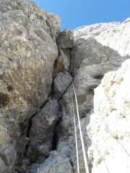 L4′ : 5c, 45 mètres, un piton; Du couloir précédemment cité, ne pas suivre la vire à gauche mais monter légèrement à droite de l’axe du couloir, pour retrouver plus haut la terrasse de R4 que l’on retrouve en traversant à gauche.