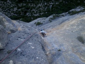 Aujourd’hui, elle est entièrement équipée ou presque. Même si certains points sont parfois un peu éloignés, cela a permis à des générations de grimpeur de découvrir ce morceau d’histoire, et peut être plus largement l’escalade en fissure dans les gorges. Ces fissures rondes, déroutantes… avec le matériel moderne, on pourrait la parcourir entièrement ou presque en ne s’assurant qu’avec des protections naturelles, et grimper ainsi une voie encore plus belle. Mais doit on laisser vierges toutes les fissures ? Et équiper tous les murs? Ainsi, comment débuter en fissure? Selon moi, l’escalade traditionnelle n’est pas une activité qui doit se pratiquer obligatoirement à chaque occasion et que quand cela est adapté. Les anglais ne sortent pas les coinceurs que quand ca les arrange! Et pour ceux qui veulent poser les joujoux pas d’inquiétude : l’Estamporanée, toute proche, ne souffre pas d’aseptisation!