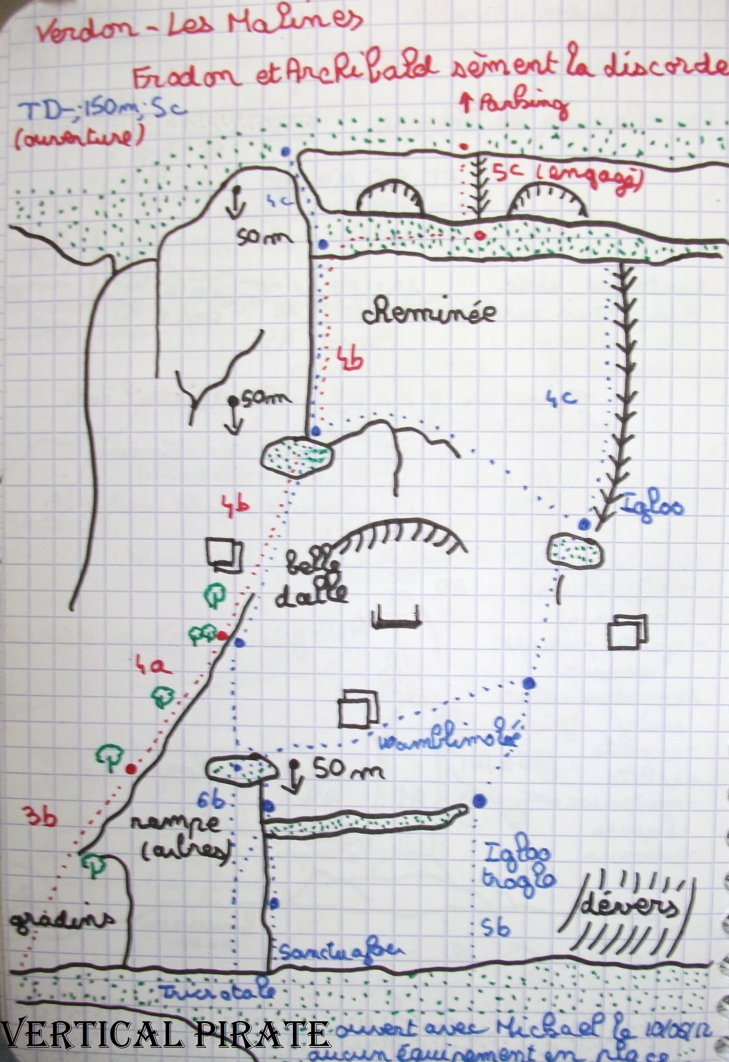 Nous avons parcouru cette ligne logique suite à un but itinéraire dans « la discorde » (d’où le nom de la voie! Je me suis vengé par la suite): lorsque l’on rate une voie au Verdon, on se sent souvent assez piégé: perdu au fond du canyon, il faut ensuite remonter au plateau! Avec Mika, nous avons remonté le cours du Verdon jusqu’à ce qu’une ligne semble bien vouloir nous laisser rentrer chez nous. Nous l’avons trouvée!