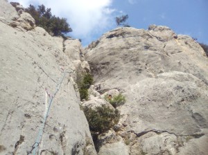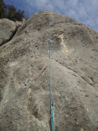L2 : 6c; Cheminée rigolotte, puis une section très technique à sa droite dans du pur rocher local, des plaquettes dans les pas durs, escalade engagée sinon… Dans le haut, on revient dans la cheminée, qui ne se laisse pas si facilement dompter. Selon moi la longueur clé… Relais sur une terrasse échappatoire à pied, sentier de descente.