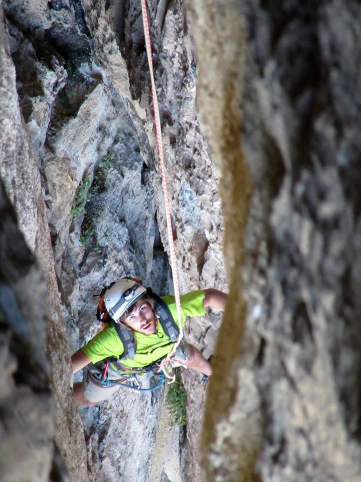 L4 : 6c ou 6b et A0; LA longueur ! Cheminée hyper dévers, avançant de plusieurs mètres, plein gaz ! Placements, bacs éloignées, escalade déroutante… et relais sous la pluie !