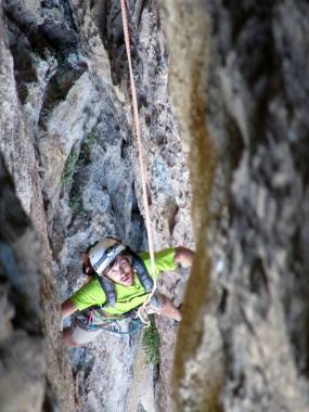 L2 : 4c ou 6b; Longueur de spéléologie non équipée, tout au fond de la cheminée (ambiance fantastique, même si cela ne grimpe pas vraiment…), parfois un peu malcommode. On rentre profondément « dans la paroi » pour revenir ensuite vers l’extérieur (suivre la lumière!). Frontale nécessaire!! On peut également passer en dehors de la fissure (6b équipé, apparemment pénible).