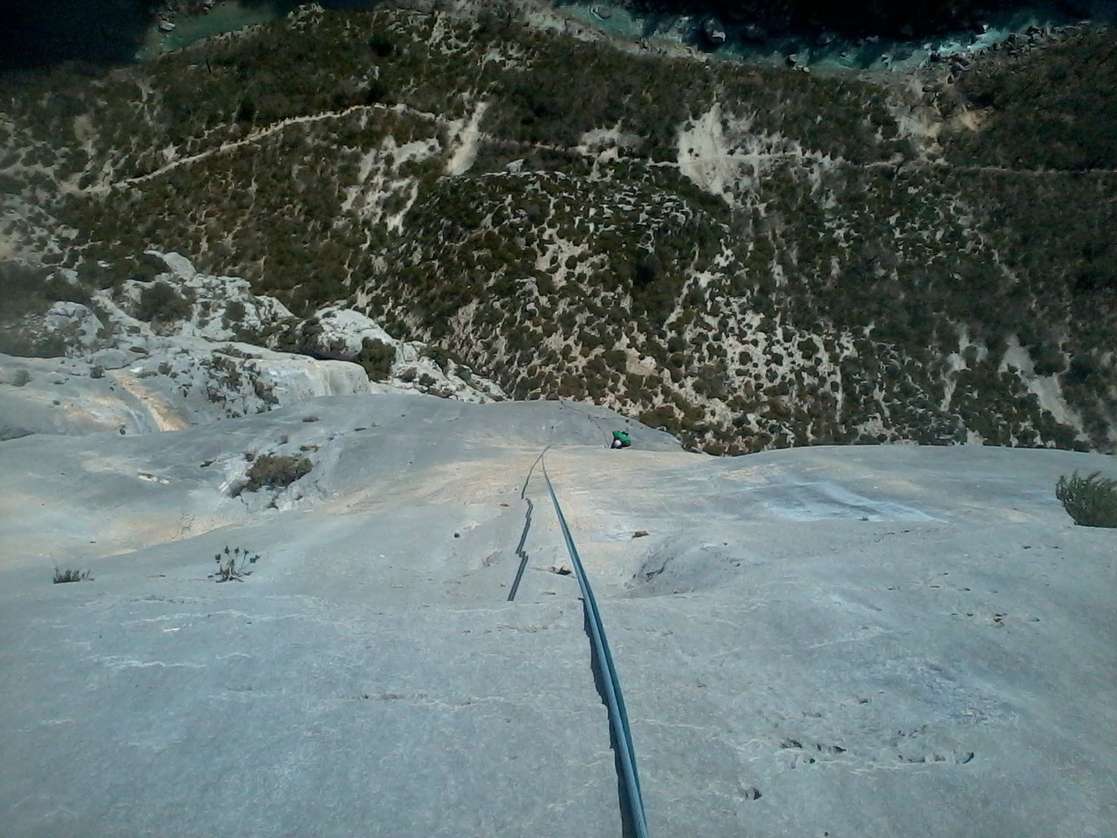 L12: 5c; Remonter le dièdre (attention, le cade ne semble pas exceptionnellement solide!), passer un relais facultatif et sortir au mieux. Encore une très belle longueur!
