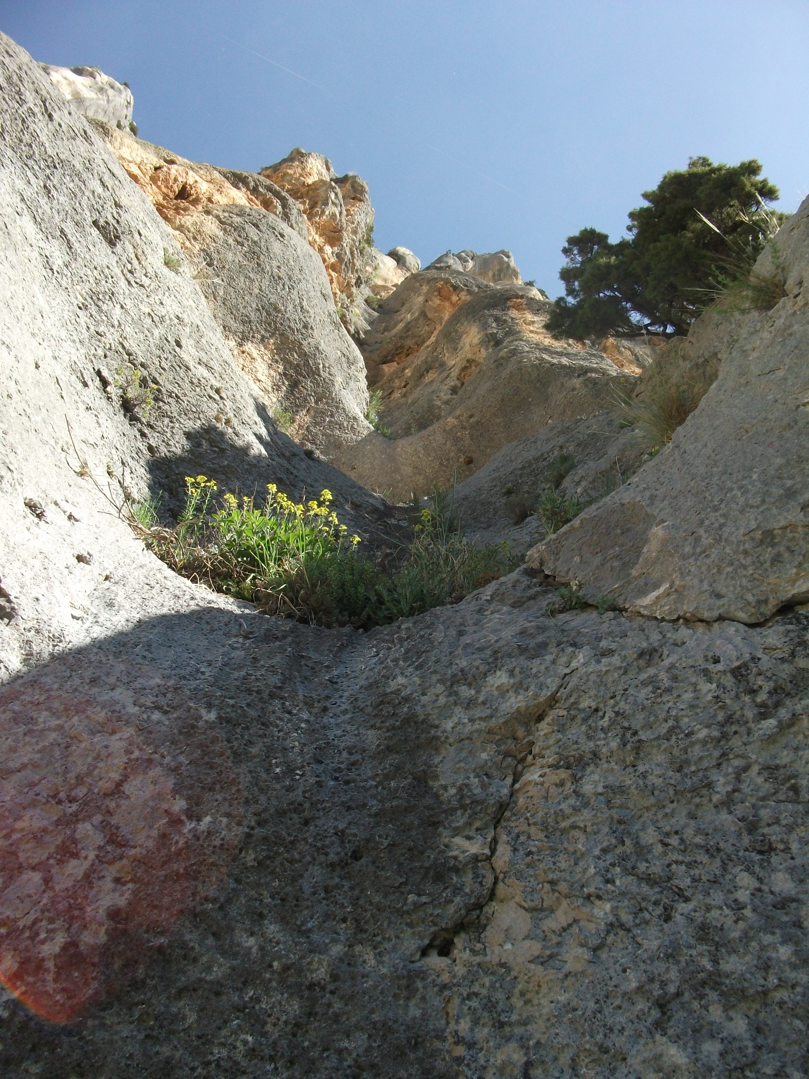 L3 : 6a; Droit au dessus, sympa dans du rocher jaune raide et prisu, sur le fil du pilier bordant le fameux toboggan.