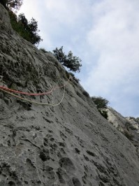 L3 : 6b+; en ascendance à gauche puis droit dans un pilier à trous. Longueur mal équipée car les points sont parfois décalés de la ligne de libre.