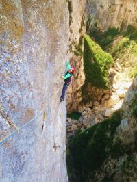 - L’usage du monde, D+; 6a+ ou 5b+, 120 mètres; La plus belle voie facile des gorges?