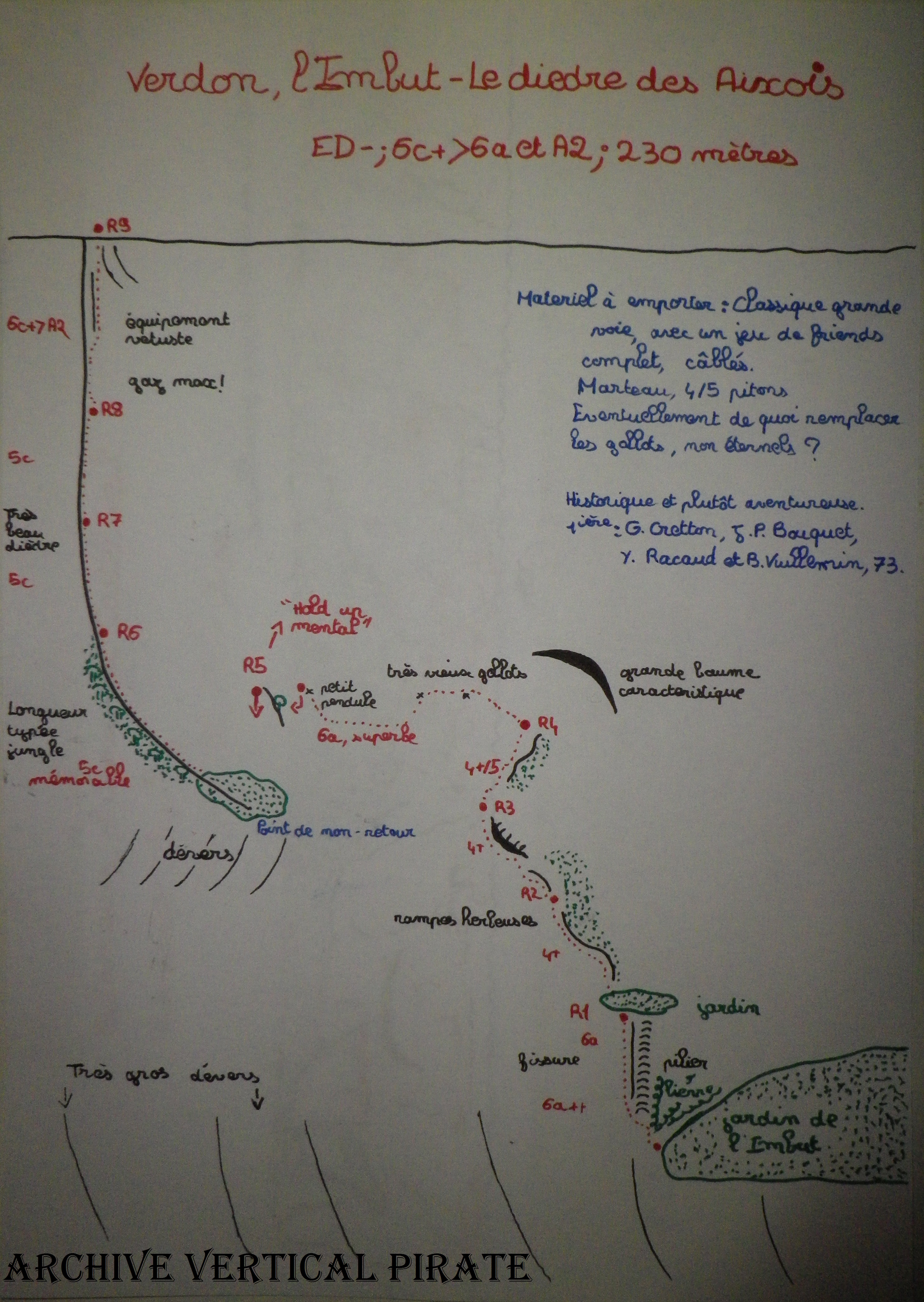 Aujourd’hui, le dièdre des Aixois reste une voie mythique du Verdon, car sa ligne est magnifique et évidente depuis les belvédères. Il s’agit toutefois d’une escalade qui n’a rien de moderne: très végétale, avec du rocher de qualité variable et un équipement totalement pourri. Cependant, la ligne est impressionnante dans ce grand mur raide de l’Imbut, et la voie engagée car passée la fameuse traversée aux gollots de L5, toute retraite devient très problématique voire impossible. Un peu d’aventure, donc!