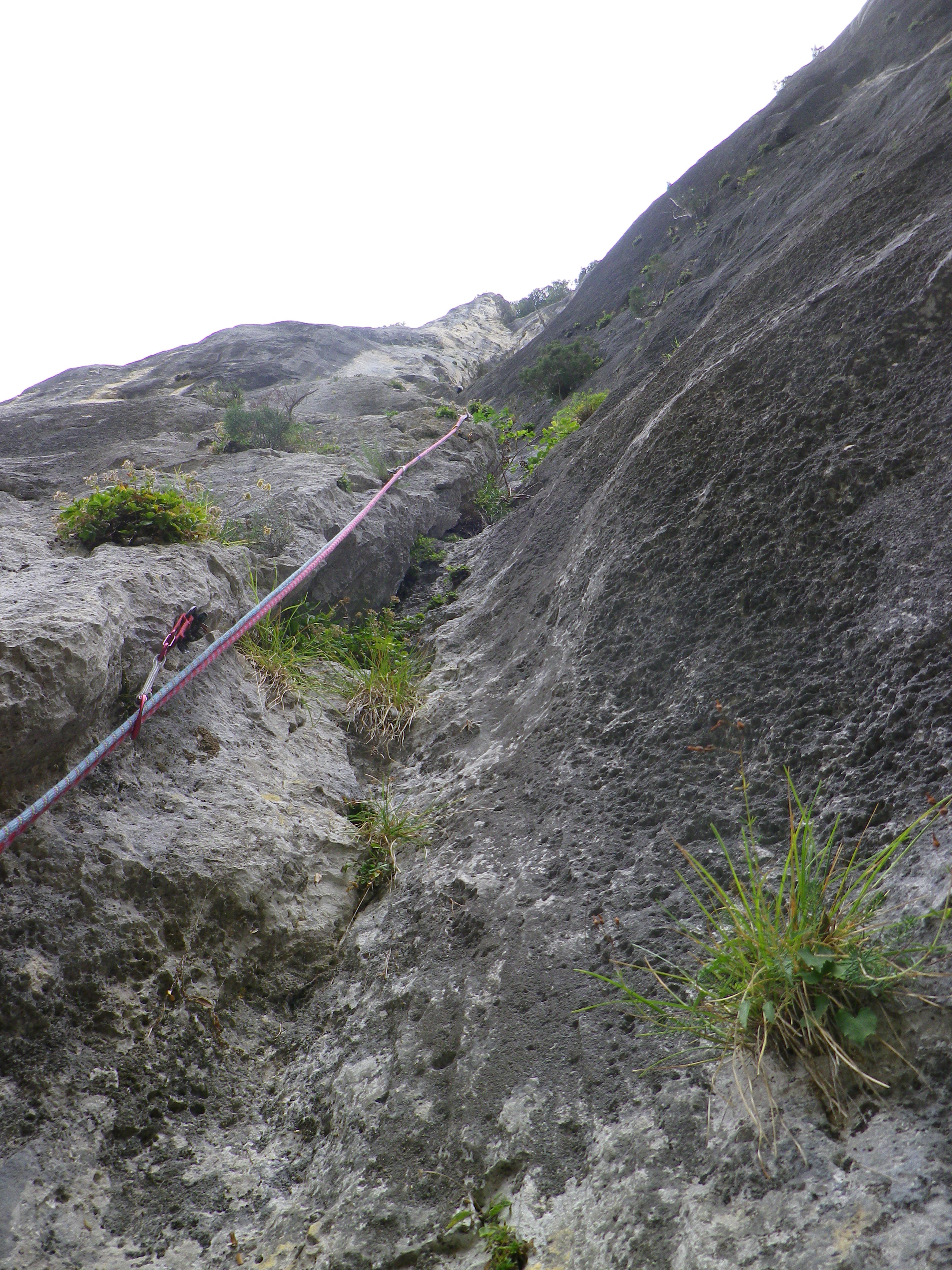 La première longueur du dièdre est vraiment atypique: on avance presque continuellement d’arbre en arbre, les pieds dans la terre, les mains dans les touffes d’herbe, avec au milieu un pas… intéressant! (et incotable) Ensuite, deux longueurs pas si simples et fort esthétiques en 5c nous posent au pied de la dernière longueur, déversante et aérienne. Le libre y est dur, et l’artif pas très rassurant car le matériel en place n’a pas du bien évoluer depuis les années 70 (6c+ ou A2).