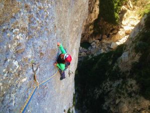 Qu’est ce qui, dans ce beau mur de l’Imbut, pourrait bien rappeler le célèbre théâtre Russe? Je n’en ai pas la moindre idée mais ce qui est sur c’est que, à moins de ne pas avoir le niveau ou de détester l’escalade en mur à trous, il est bien difficile d’en avoir marre dans cette voie exceptionnelle! En effet, cette voie est selon moi de grande classe, pour plusieurs raisons. Tout d’abord, le rocher y est exceptionnel, à trous plats souvent assez franc, ce qui offre des longueurs de rési où l’enchainement à vue dépendra de la prise de décision. Ensuite, les longueurs sont variées, et la gestuelle offerte justement par cette escalade à trous est très intéressante. Enfin, l’ambiance est très présente : en plus d’un gaz ici réellement enivrant, une fois les rappels tirés, il vaut mieux sortir sa voie, un but au milieu de ce mur serait pénible… ‘autant plus que l’équipement est parfois un peu aéré, et l’escalade obligatoire!