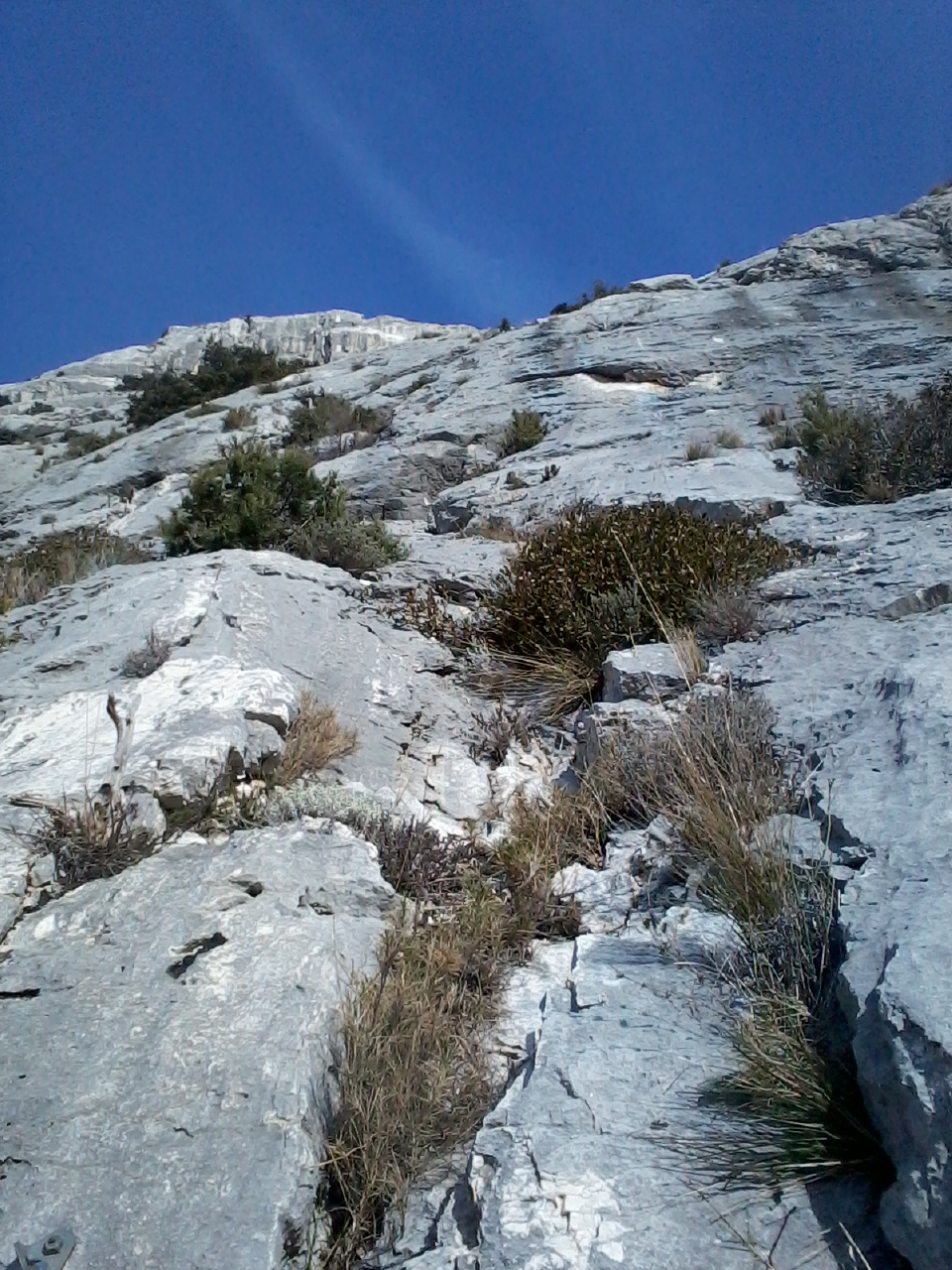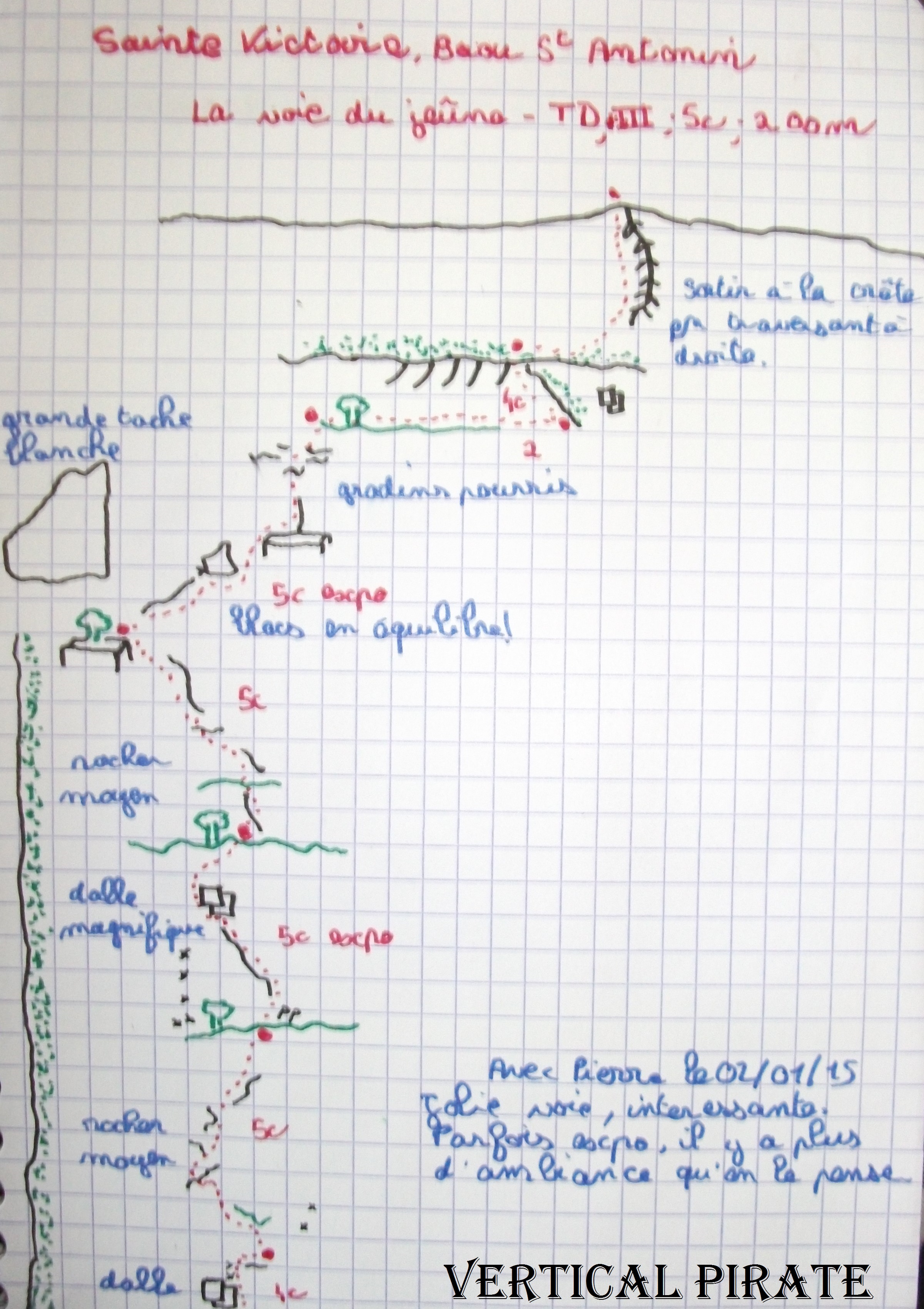 Le départ est assez évident à trouver (voir topo en photo) et est matérialisé par la présence de plaquettes. Il s’agirait d’une voie récente, qui croise la notre. ces plaquettes mystérieuses seront ensuite oubliées durant toute la voie, jusqu’à trouver sous la barre sommitale un relais composé de ces même goujons tout neufs.