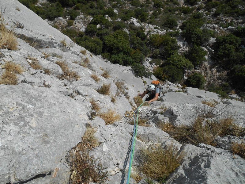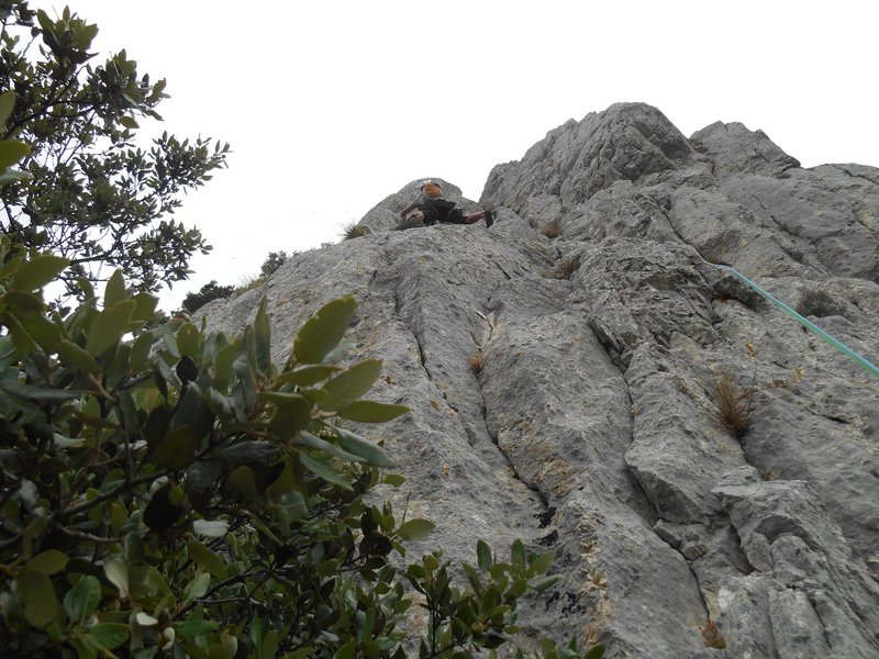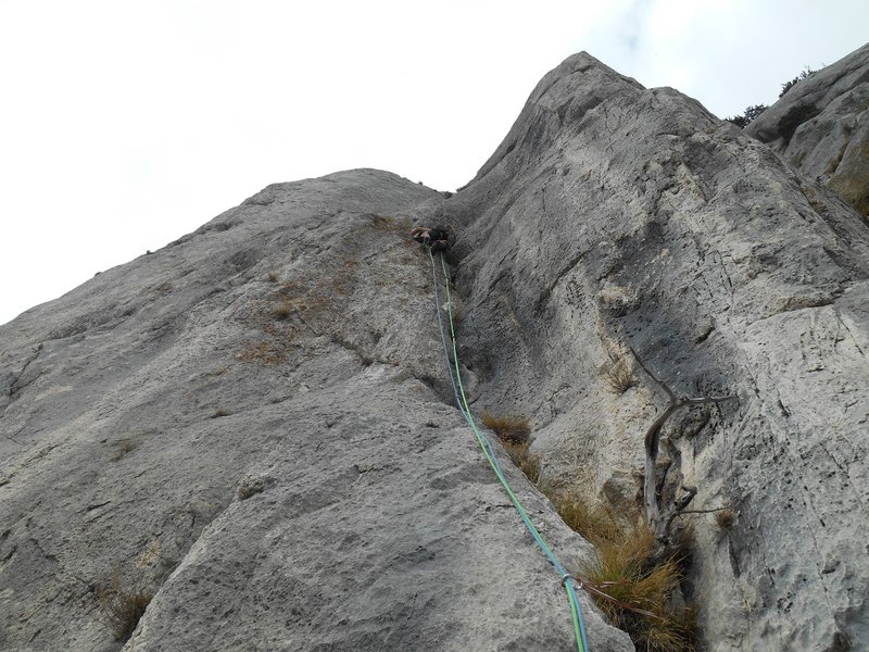 L1 : 5c, 40 mètres; Très belle fissure/dièdre, avec deux passages un peu plus raides, au milieu et en haut, bien prisus (pitons). Un peu de mauvais rocher. Relais sur deux pitons, renforçable.