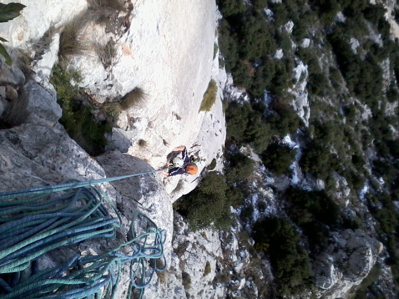 L3: 6a+. Poursuivre cette fissure qui s’élargit, jusqu’à un bombé bien protégé (crux). La fissure oblique ensuite à gauche et devient moins difficile à escalader, pour s’achever sur une plate forme où le relais est facile à construire. 45 mètres, un relais intermédiaire est possible.