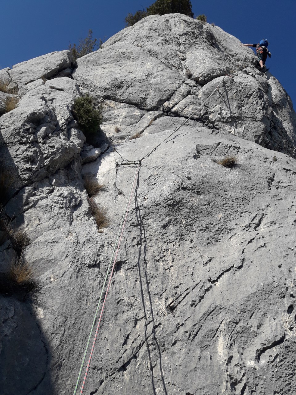 L7 : 6b; Très bel éperon arrondi avec un réta subtile. On poursuit en ascendance gauche, jusqu’à une zone facile où l’on fait relais sur un chêne, proche du fil de l’arête après une zone déboisée.