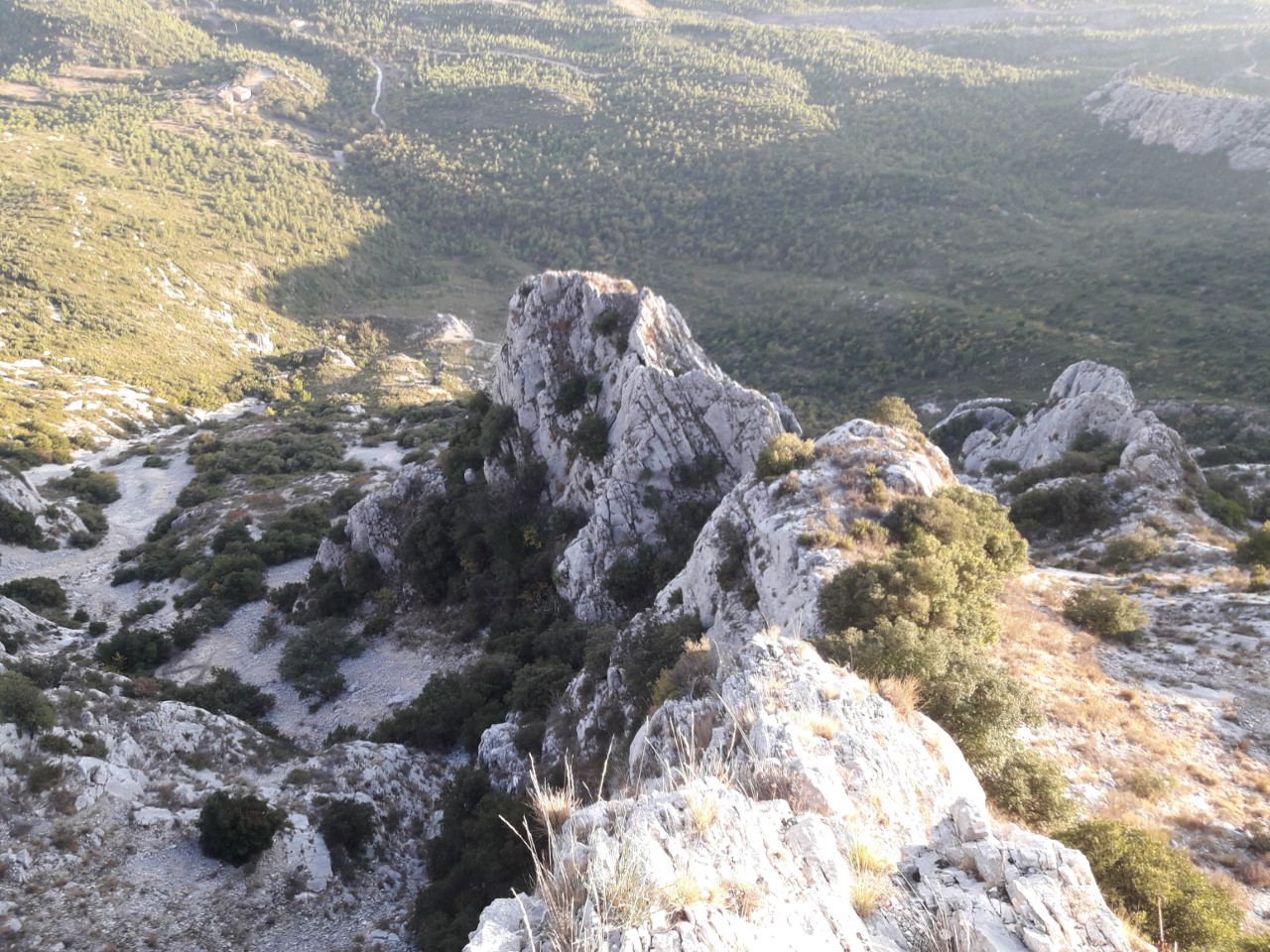 Descente : Sentier noir du col de Vauvenargues (pourri en pierrier), quelques dizaines de mètres à l’est de la sortie de la voie.