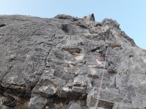 Transition : Contourner le bosquet par la droite (sinon on loupe la quatrième longueur!), jusqu’au pied d’un pilier marquant le second ressaut.