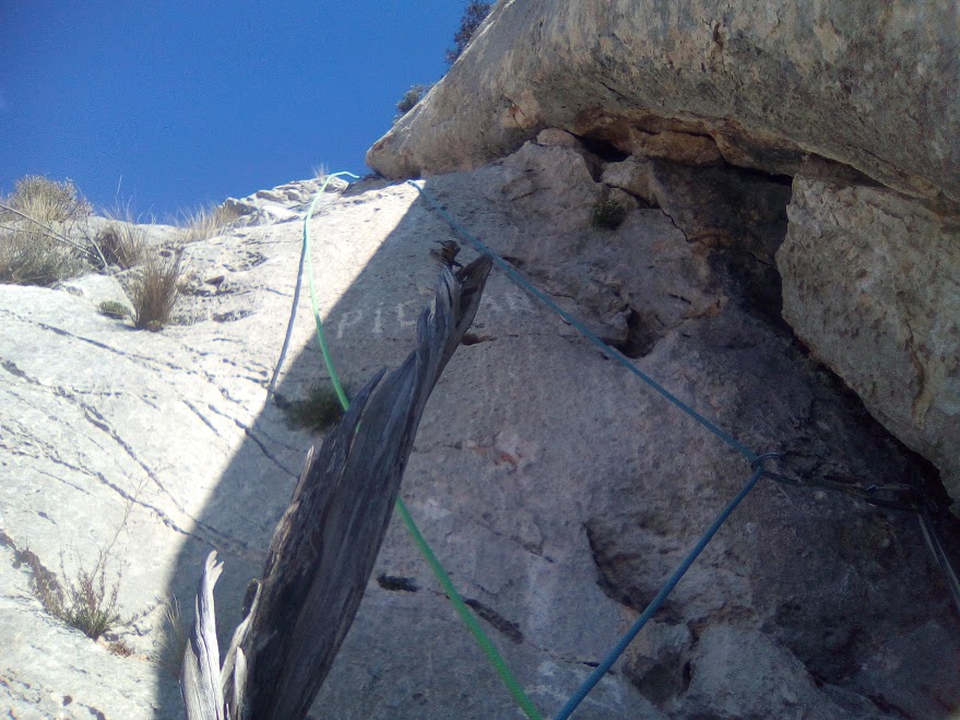 L1 : 5b, 40 mètres; Départ dans une dalle grise peu protégeable, puis on franchit un court surplomb, et l’on poursuit par le dièdre (quelques pitons). Escalade soutenue, la deuxième partie vaut bien son 5b (4c sur le topo). Relais sur pitons à droite de la base du grand dièdre suspendu, renforçable.