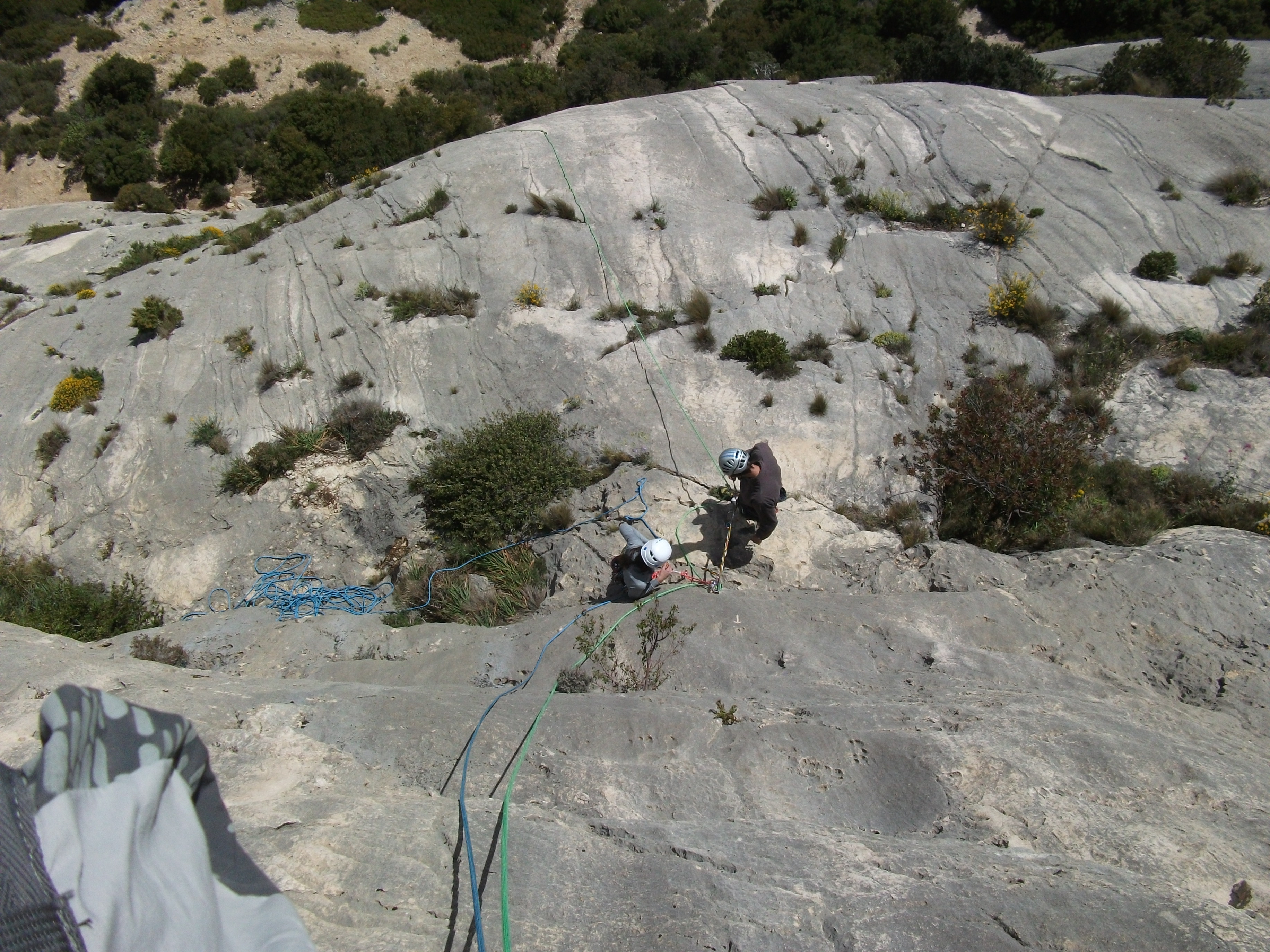 La descente se fait en rappels, directement dans l’axe du dernier relais (trois rappels, dans une voie plus directe).