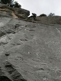 L1 : 5a; beau mur raide aux prises franches, traverser la vire a gauche pour prendre le dernier relais.