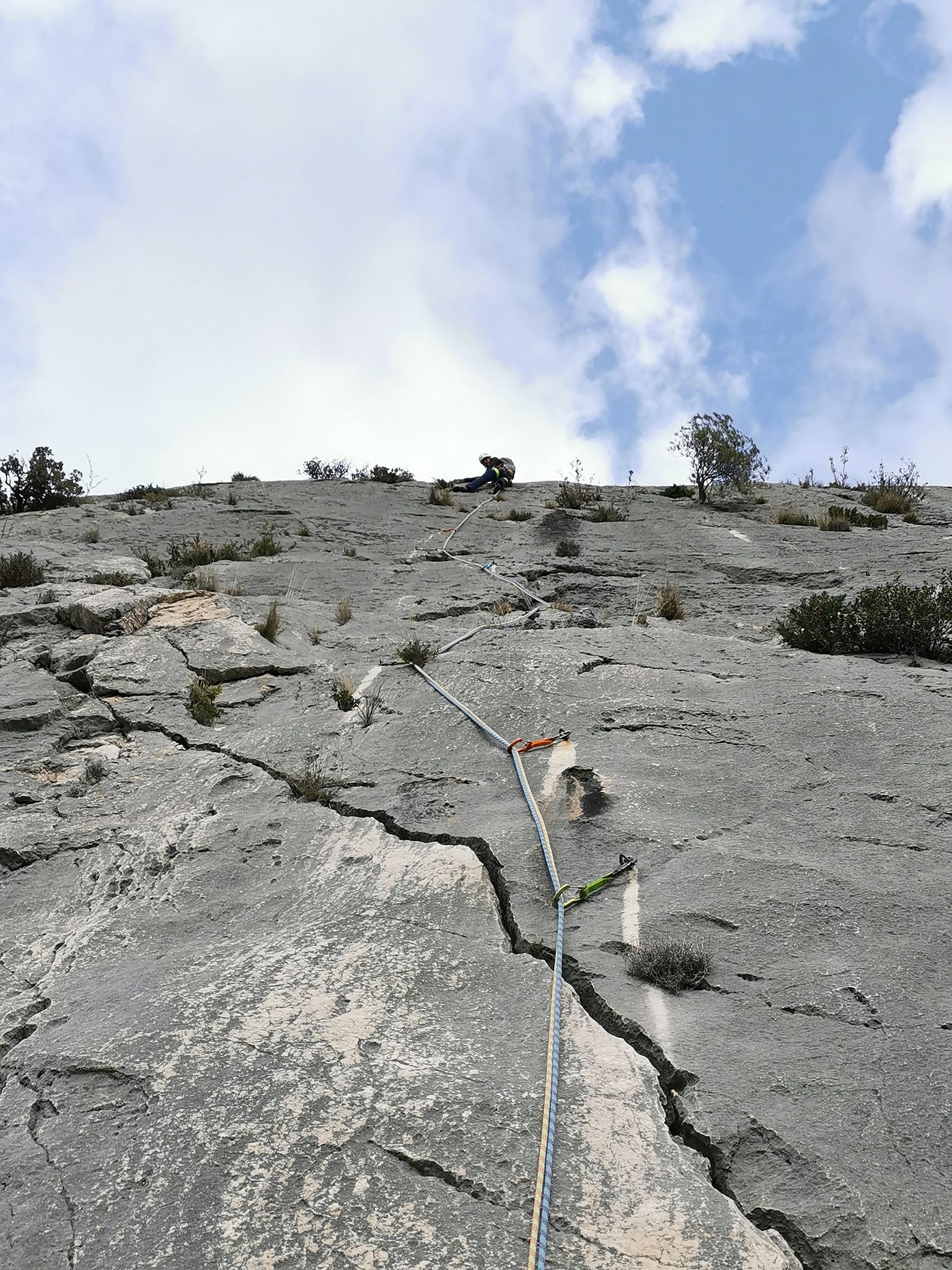 L3 4c officiellement, bon 5c; traversée a droite sans monter (ligne de prises), on croise deux voies et on trouve le relais de la troisième à droite, que l’on rejoint depuis son aplomb. Normalement la voie sortait plus à droite et esquivait de dernier crux.