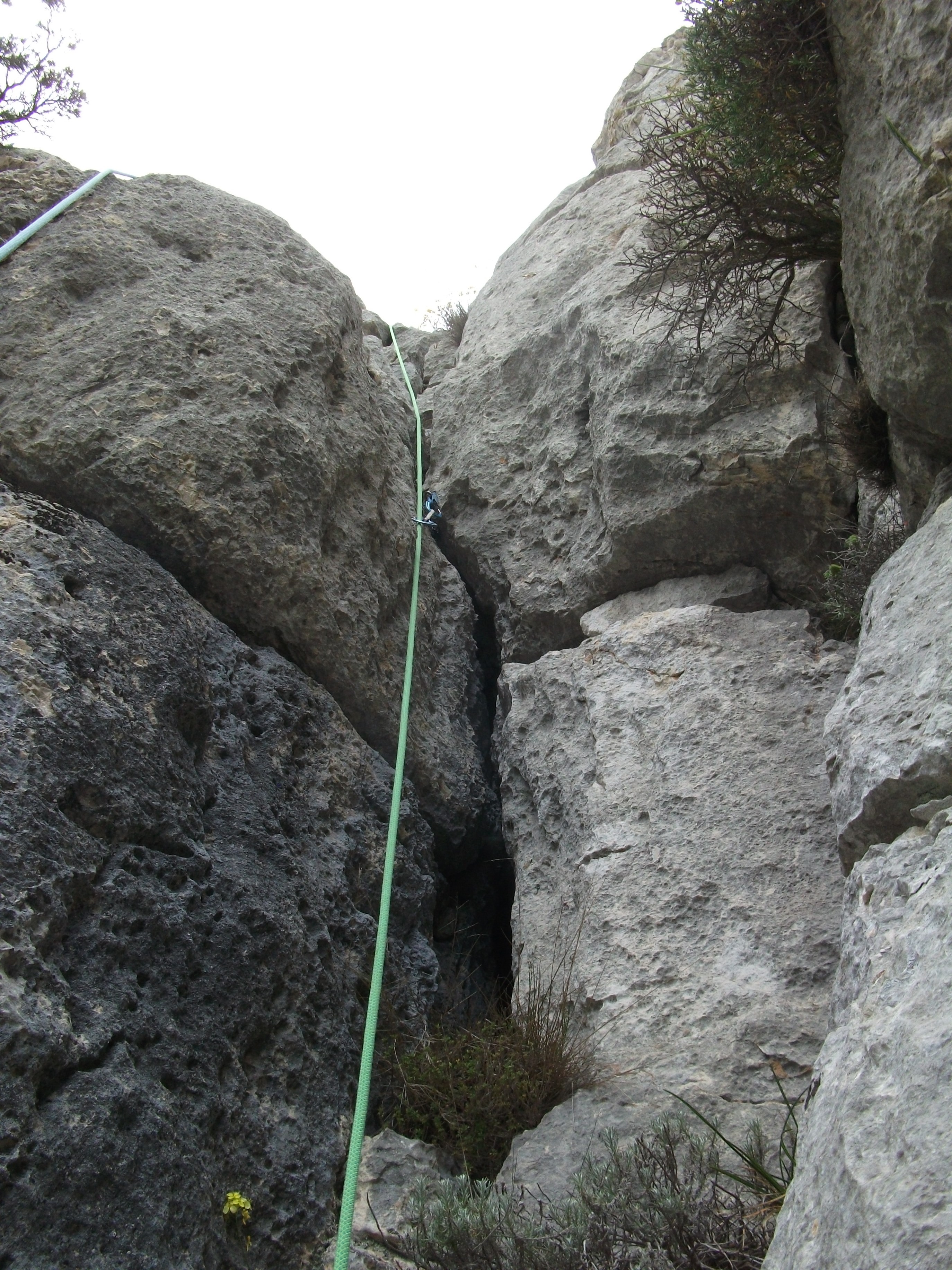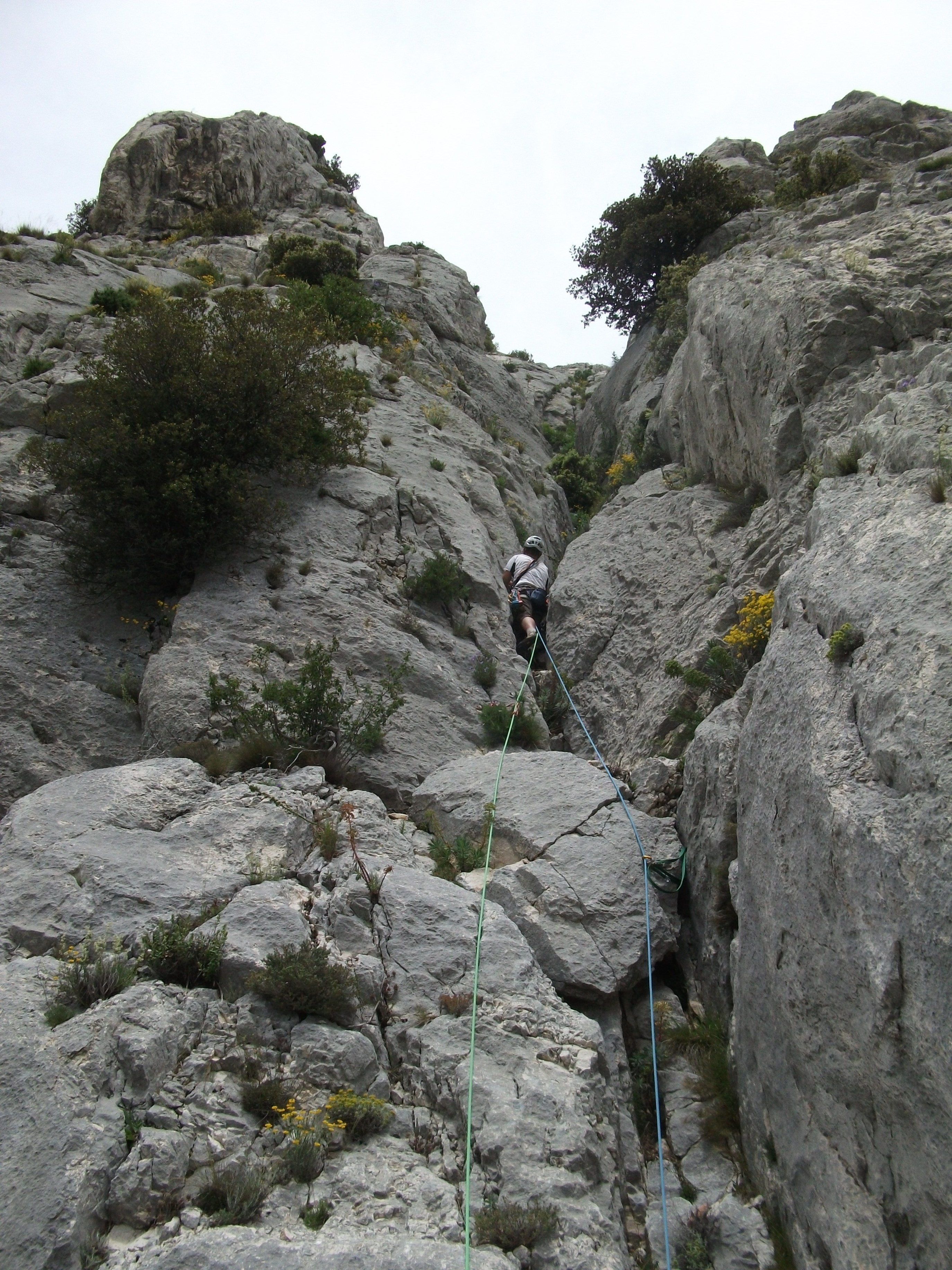 L2 : 4c; Poursuivre cette cheminée, puis préférer la fissure de droite. Des petites vires viser un gros feuillu vers la gauche, équipé pour un rappel.