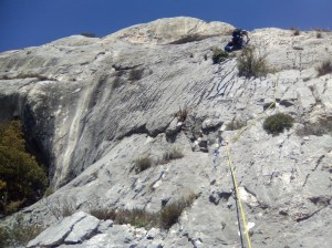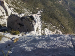 Sortie : En corde tendue par l’arête au dessus le dernier relais (2, 3 max) jusqu’à la crête. Intéressant.