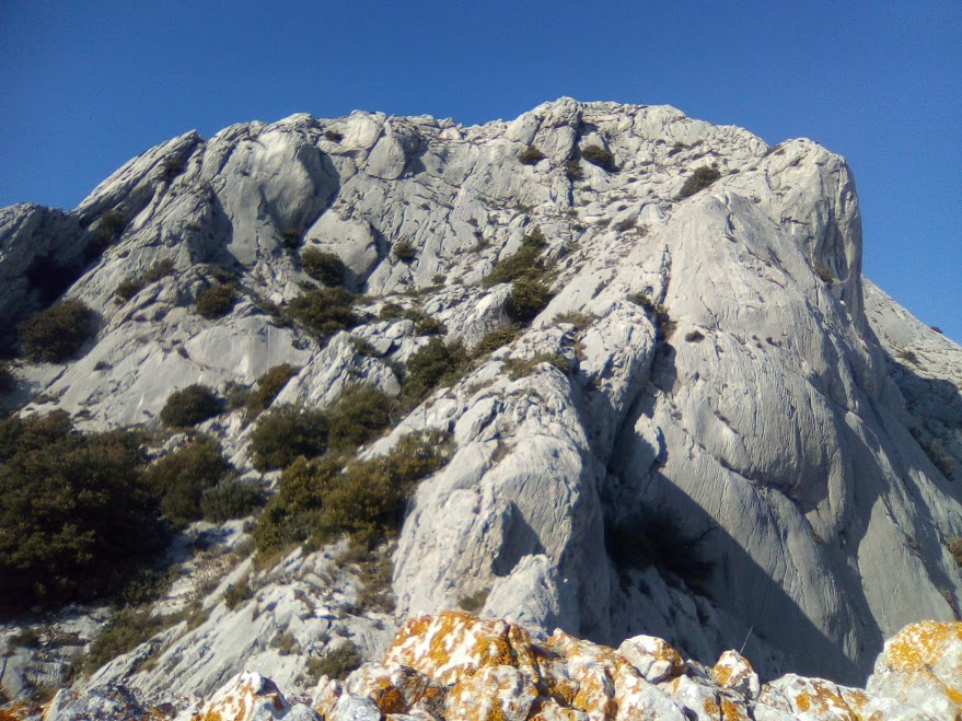Une voie atypique à la Sainte Victoire, dans l’une des belles parois. En effet, le quarantième rugissant est une voie à l’équipement hybride, c’est à dire présent dans les parties les moins protégeables avec des coinceurs, et absent lorsque ces derniers peuvent assurer assez facilement la sécurité. Très courants dans certains massifs notamment granitiques (Massif du Mont Blanc, Bavella, Grimsel…), ces itinéraires ne sont pas majoritaires dans le sud de la France. D’ordinaire, je n’apprécie pas énormément les voies dites « initiation au terrain d’aventure » car on a souvent l’impression de sortir des coinceurs pour rien, et que l’on ne s’initie finalement pas tant.