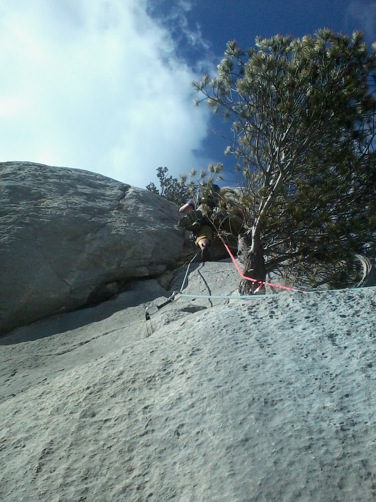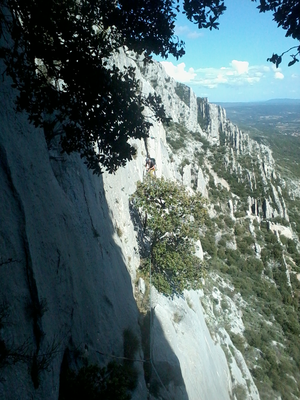 L3: 2, 20 mètres. Continuer cette traverser jusqu’à un arbre, remonter le dièdre évident derrière, relais sur la terrasse (un point unique, à compléter avec un point plus haut).
