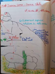 Il y a cependant un souci dans le topo, la longueur en 5c propose un départ en 6c, et l’artif n’est pas si évident et le risque de retomber sur la vire probable. N’hésitez pas à vous munir d’un bâton pour clipper si vous faites moins d’un mètre soixante dix ! On peut supposer qu’une ou plusieurs prises aient pu disparaitre et que ce passage a été équipé avant la casse de ces prises.