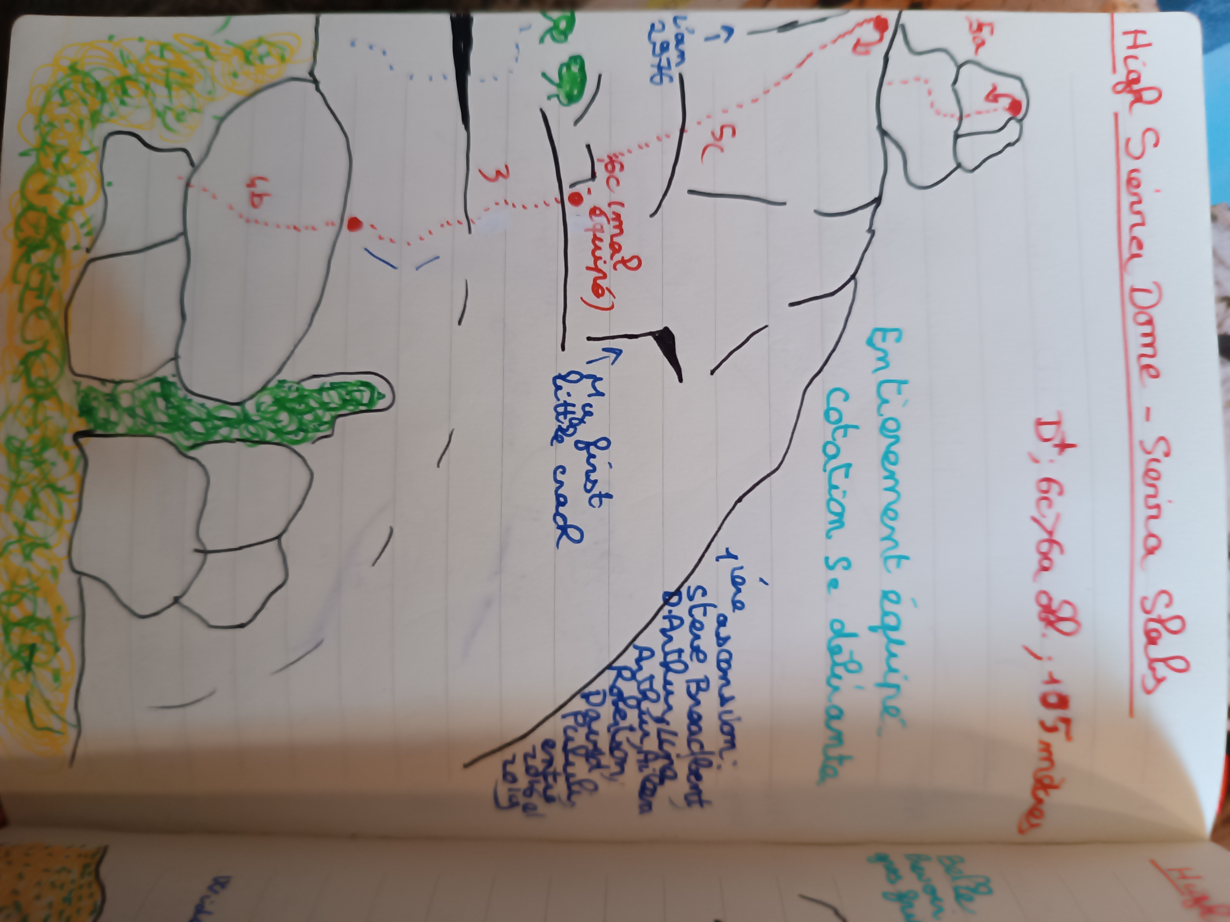 Dans ce paradis de l’escalade traditionnelle, il existe également des voies entièrement équipées, remontant de belles dalles souvent très lisses. Plusieurs ont été tracées au High Sierra Dome (dont une actuellement déséquipée), et celle-ci marque l’extrémité gauche du secteur classique, avant le grand mur raide de Back Side.