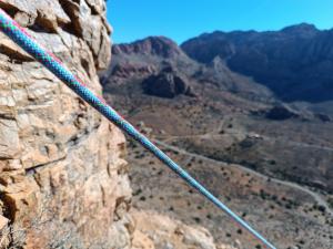 L5 : Nous sommes sortis à droite mais l’option gauche semble plus logique. On remonte ensuite un couloir jusqu’à une grande terrasse. Relais légèrement à gauche au pied d’un court mur rouge..