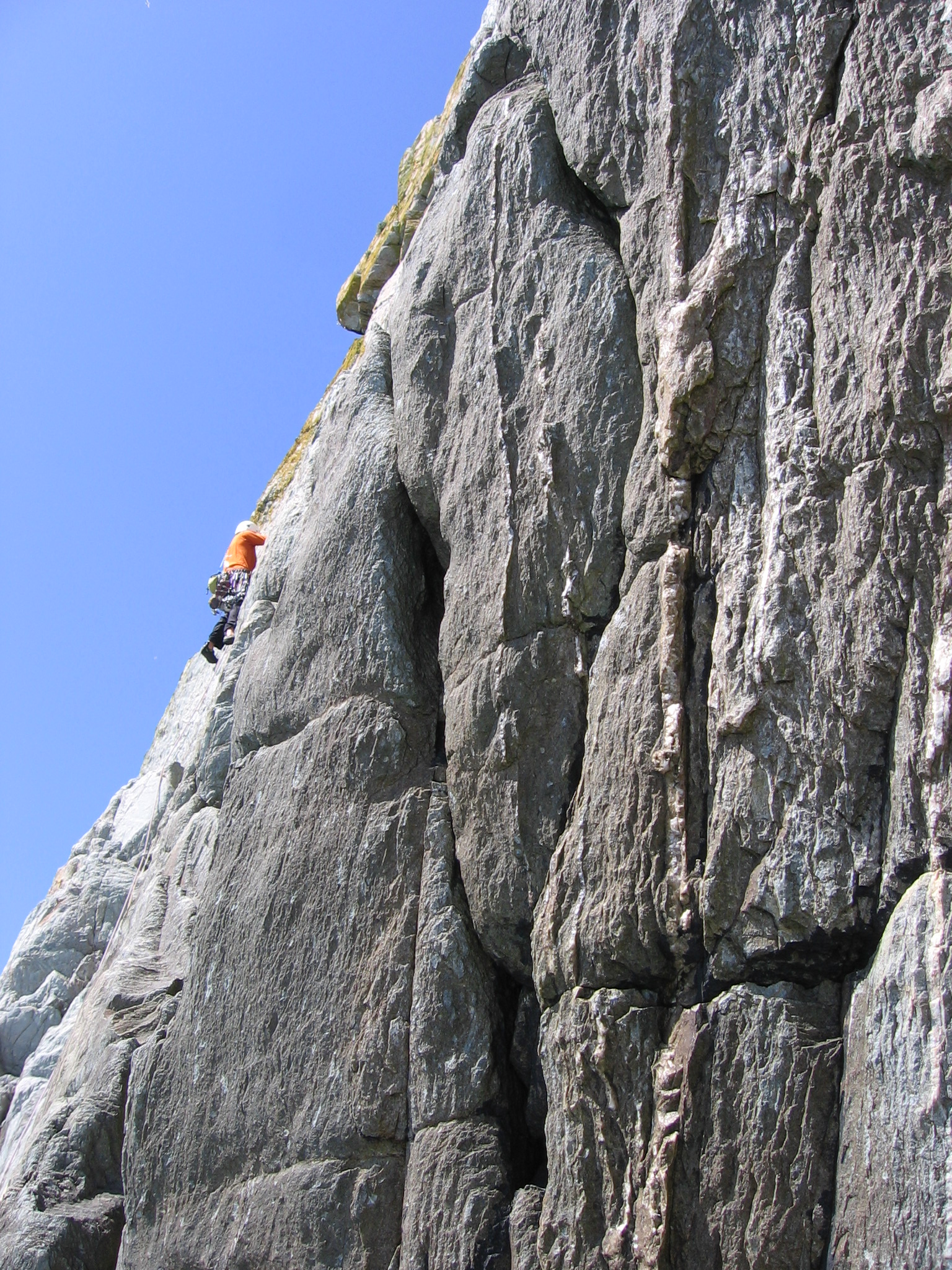 L4: HVS 4c; LA longueur qui mérite de venir du bout du monde! traversée sous les toits et entre les dévers pour rejoindre une cheminée à gauche de 3/4 mètres. L’ambiance est très aérienne, l’escalade bien prisue. En cas de chute, une belle galère vous attend: pendu cent mètres au dessus de la mer d’Irlande et retenu par je ne sais quel coinceur, il va falloir remonter au plus vite sur la corde… Relais sur blocs.