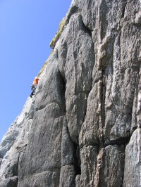Lighthouse Butress direct est une voie cotée VS 4c, soit du 5c très facilement protégeable, et aux relais faciles à construire. Deux rappels sur pitons rouillés nous posent sur une petite terrasse, à quelques mètres de la mer. Il faut ensuite remonter, grâce à une escalade gratifiante sur du bon rocher.